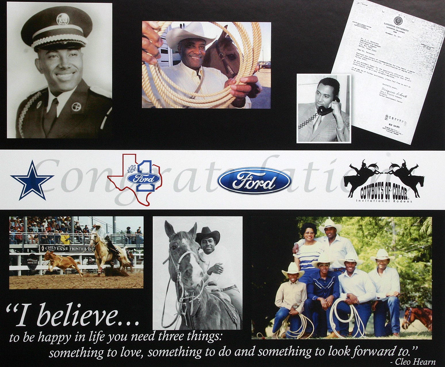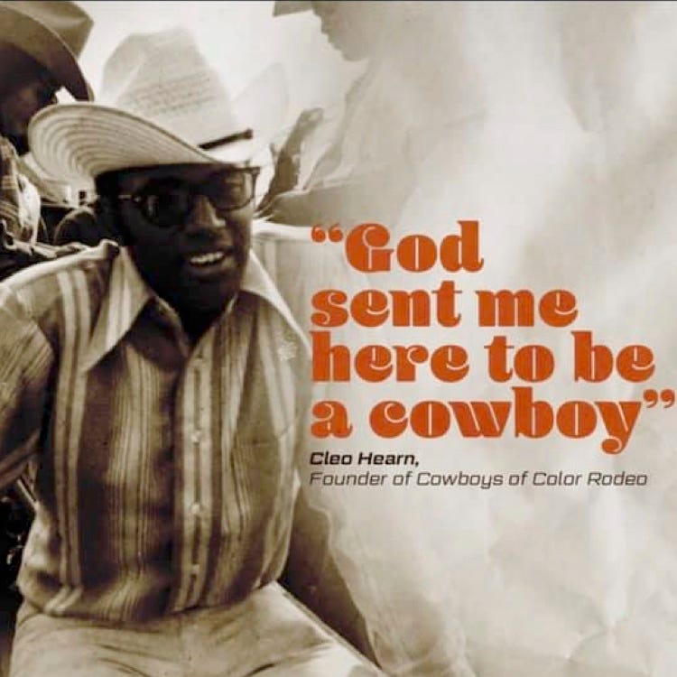 In addition to, international Western Legend Mr. Black Rodeo, among his many awards, Cleo received his Star on the Texas Trail of Fame in the Fort Worth Stockyards and the Lane Frost Award, was inducted into the Texas Black Sports Hall of Fame, the Texas Cowboy Hall of Fame and the National Rodeo Hall of Fame. His adult hometown Lancaster, Texas proclaimed May 10th as Cleo Hearn Day to be celebrated annually.